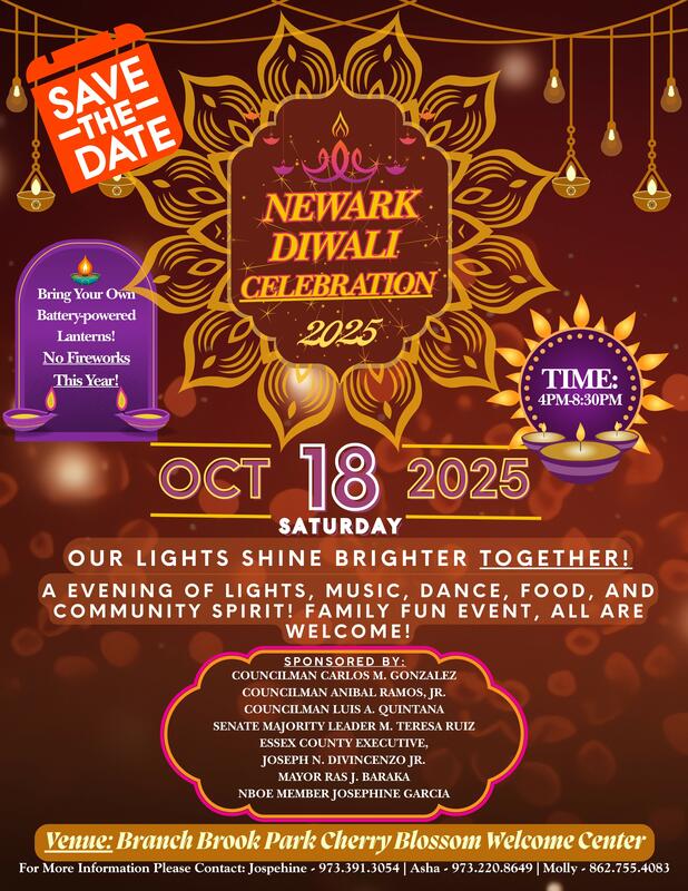 Newark city officials announced that the community is invited to gather for Diwali 2025 on Saturday, October 18, from 4:00 p.m. to 8:00 p.m. at the Cherry Blossom Welcome Center in Branch Brook Park.