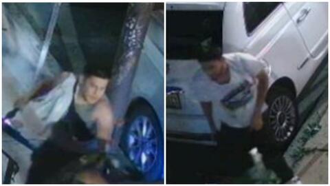 According to police, Suspect #1, described as a white Hispanic male, was wearing black shorts, a grey tank top, a white T-shirt over his shoulder, black sneakers, and a black crossbody fanny pack.