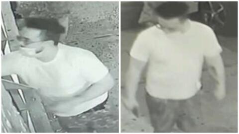 The video shows the suspect, a Hispanic male, using an object to break the store window.