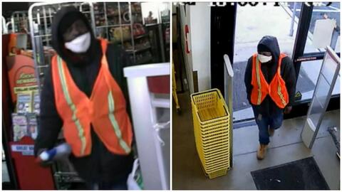 According to police, the suspect, a Black male, is described as 5’6” with a medium build. He was wearing an orange reflective vest, a black sweatshirt with a hood, blue jeans, a white mask, and brown boots.