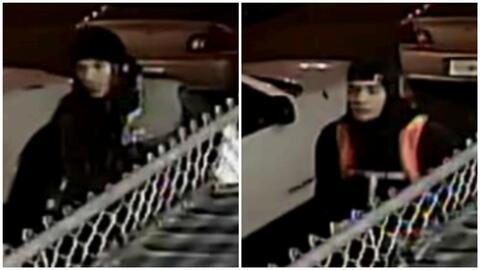 According to police, the first suspect was wearing a purple and grey bubble jacket, a sweatshirt with a black hood, blue jeans, purple and grey sneakers, and a black skull cap.