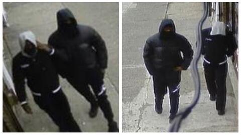 The second suspect is also described as wearing a gray hooded sweatshirt and a black and white jacket with white lettering in cursive on the right chest.