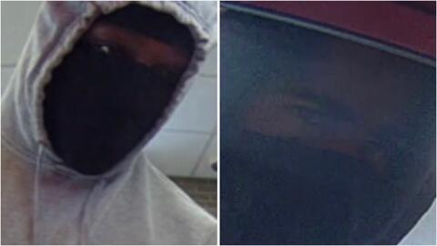 The second suspect, officials say, was wearing a grey sweatshirt with a hood, a black ski mask, and red Adidas jogger pants with white stripes.
