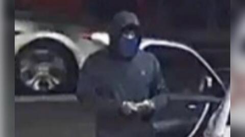 The suspect is described as a black male, approximately 6 feet tall, with a medium build, officials say and was wearing black Puma sweatpants with a white stripe running along both sides of his legs, a black hooded sweatshirt, a blue/purple mask, and white sneakers.