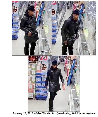 Authorities say the man depicted in the photos is NOT current a suspect, but they are actively looking him for questioning for an incident that occurred at approximately 10:50 p.m., where officers responded to Tony’s Liquor Store, located at 401 Clinton Avenue, for shots fired reports with injuries.