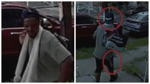 The suspect is described as a Black male with a light complexion, wearing a gray T-shirt, black pants with two stripes on the sides, a white scarf around his neck, a navy-blue baseball cap, and dark-colored pool slides.