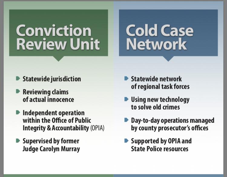 Through the CCN, the Attorney General’s Office will assist in developing a statewide network of regional cold case task forces, similar to the North Jersey Regional Task Force announced last week. The regional cold case task forces will operate independently, but with support and resources from OPIA and the New Jersey State Police.