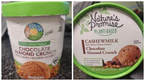 The mislabeling issue involves the lid displaying "Nature's Promise" brand Cashewmilk Chocolate Almond Crunch Non-Dairy Frozen Dessert, while the carton was "Full Circle Market" brand Coconutmilk Chocolate Almond Crunch Frozen Dessert.