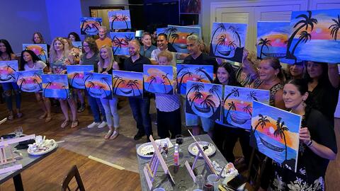 Zhe guided her budding artists step-by-step as they created their own versions of a tropical sunrise, complete with palm trees and a hammock.