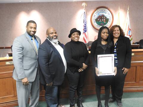 Union County Freeholders presents resolution to singer/songwriter Alexis Morrast of Plainfield for winning first prize at “Showtime at the Apollo,” a brand-new one-hour special and reimagining of the classic talent showcase series.
