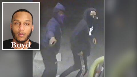 The second suspect (pictured on the left in the photo) is still at large. He is described as an African American male wearing a blue hoody and purple face covering.