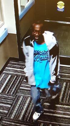 Authorities said the suspect wore a gray and black zippered hooded jacket, light ripped blue jeans, a blue t-shirt with dark lettering, and white and blue Jordan No. 4 sneakers.