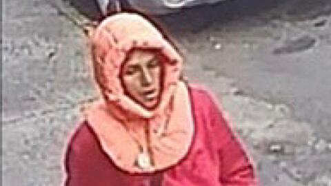 The suspect was wearing a red hooded sweater with an orange hood on top, white sweatpants, a gold chain with round medallion, dark-colored slippers and black socks.