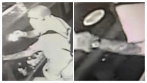 Surveillance video captured a male with a light complexion taking money from cash registers and damaging bar equipment. He had tattoos on both arms and was wearing a shirt and jeans.