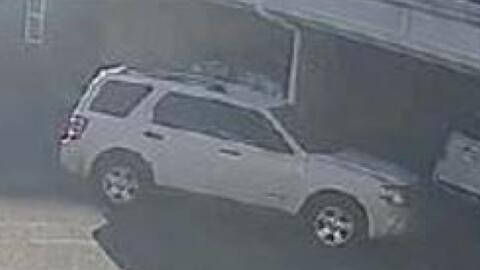 The suspect vehicle, which has dents on the hood and damages to the driver’s side fender, entered the parking lot where the victim’s vehicle was located.