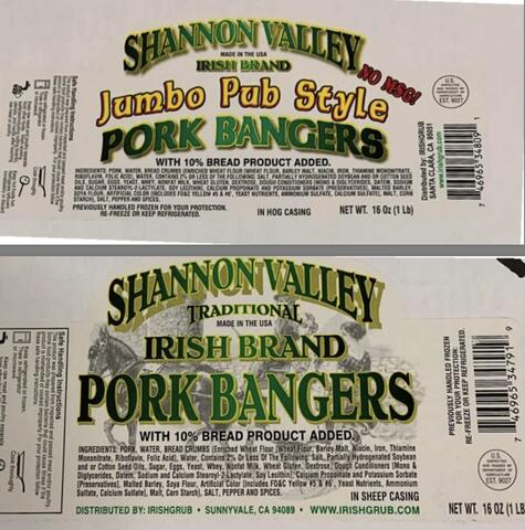 16-oz. plastic wrapped packages containing “SHANNON VALLEY IRISH BRAND Jumbo Pub Style PORK BANGERS.”