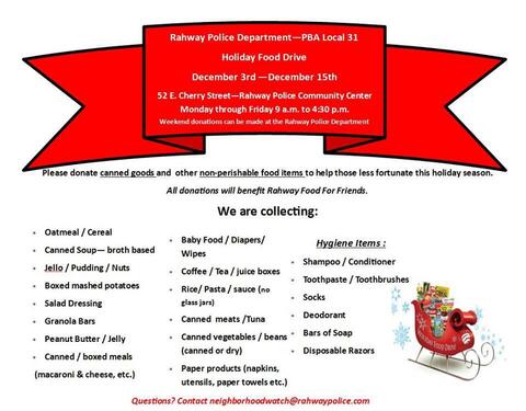 Rahway Police Department will be hosting their 'Holiday Food Drive' of canned goods and non-perishables until Dec. 15.