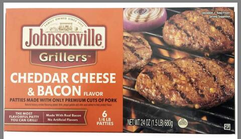 24-oz. (1.5 lbs.) plastic bag in a carton of frozen “Johnsonville Grillers CHEDDAR CHEESE & BACON FLAVOR” with “Best Flavor By: 7/24/2019” represented on the label.