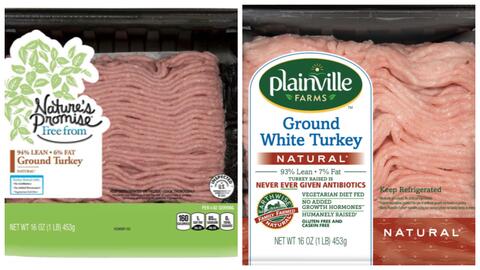 - 1-lb. packages of Plainville Farms Ground White Turkey 93% | 7% Fat with Use by/freeze/sell-by date of 1/10/21 on the front of the package.