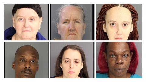 Police say Patricia Gamarra, 62, Mary Buchan, 55, Patricia Buchan, 28, Bridget Buchan, 23, Natacha Smith, 43, who is the mother of the victim, and Homer Searcy aka Omar Searcy, 39, are all charged with aggravated assault and endangering the welfare of a three-year-old child.