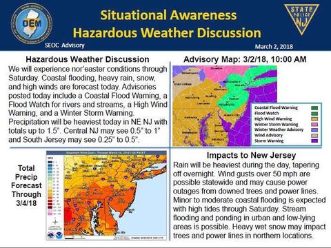 Coastal flooding, heavy rain, snow, and high winds have been forecasted out area for the remainder of the day. Advisories posted today include a Coastal Flood Warning, a Flood Watch for rivers and streams, a High Wind Warning, and a Winter Storm Warning. Precipitation will be heaviest today in NE NJ with totals up to 1.5”. Central NJ may see 0.5” to 1” and South Jersey may see 0.25” to 0.5”.