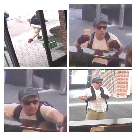 The suspect was described as a white male, approximately in his late 20’s to early 30’s, who was wearing a dark colored baseball hat, black sunglasses, a white T-shirt, tan shorts, black sneakers, black backpack and black gloves.