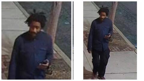 The suspect was wearing a blue button-down shirt, burgundy sneakers and black pants.