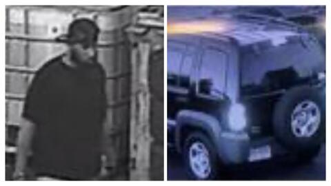 The suspect is described as wearing a black shirt, sweat pants, white sneakers, a hat and has a full beard. He was driving a dark colored Jeep.