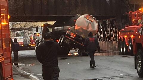 Newark emergency responders were called to a section of the city's East Ward after a tanker truck got wedged under a bridge.