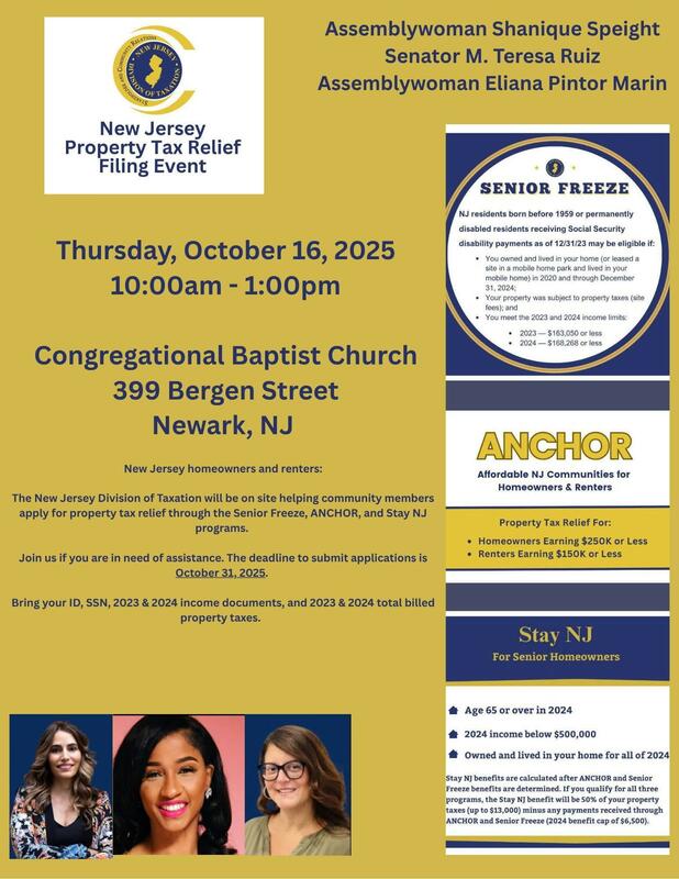 The session is being supported by Assemblywoman Shanique Speight, Senator M. Teresa Ruiz, and Assemblywoman Eliana Pintor Marin, who say their goal is to ensure that residents can take advantage of much-needed relief during these difficult economic times.