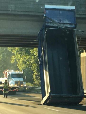It happened at around 5:00 a.m. near exit 24 -Taylor Mills Bridge- where police say the driver of the dump truck left the bed in the upright position and struck a bridge then spilled debris all over the highway.