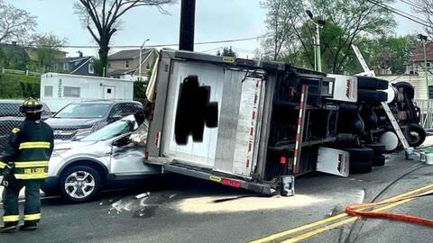 Upon arrival, fire officials said they found the two-vehicle crashed. A car collided with a commercial box truck with extensive damage, which caused an airbag deployment, and the truck overturned.
