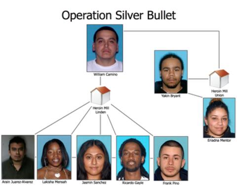 Camino, Bryant, and 13 others were arrested in late 2014, when a Guns, Gangs, Drugs, and Violent Crimes Task Force investigation resulted in the seizure of heroin with an estimated street value of more than $3 million and the outright dismantling of two fully functional, high-volume heroin mills illegally operating in Linden and Union Township, according to Union County Assistant Prosecutor Jeremiah Lenihan, who prosecuted the case.