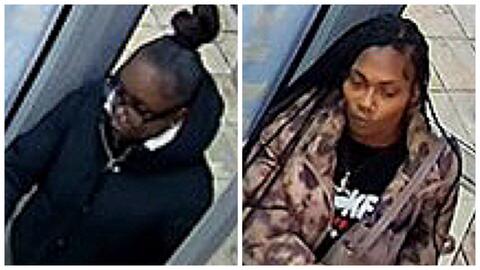 The first suspect is described as an African-American woman, approximately 5 feet 6 inches tall, with a medium build and short hair styled in a bun.