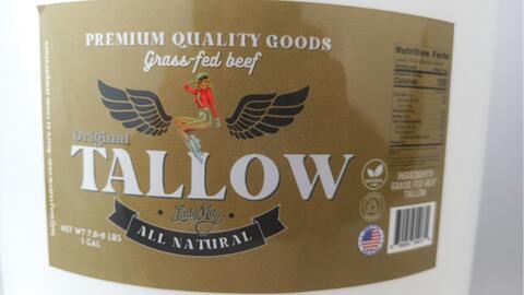 - 7.8- to 8-pound (1-gallon) plastic tubs labeled “PREMIUM QUALITY GOODS Grass-fed beef Original TALLOW Lady May ALL NATURAL”