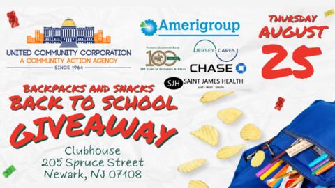 The Backpacks and Snacks Event will be held on Thursday, August 25, at The Clubhouse (205 Spruce Street, Newark, NJ 07108) from 1 p.m. - 5 p.m.