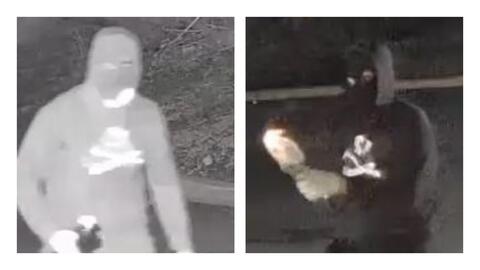 He was wearing a black ski mask, a black or dark gray hooded sweatshirt with a white emblem of what appeared to be a skull and crossbones, black pants, dark shoes, and white gloves.