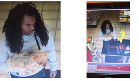 “Munchkin” had been incorrectly identified by its owner in the below photos, captured at a local pet store, and Mr. Cobb, seen with a similar dog, was sought for questioning.