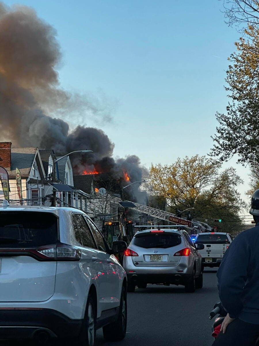 Upon arrival, crews were met with intense flames shooting through the roof of the three-story wood-framed building, quickly spreading to adjacent structures.