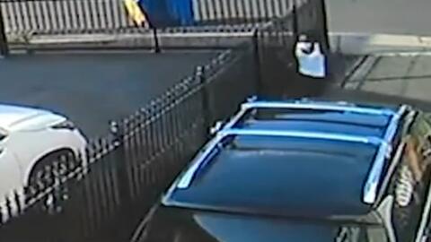 A teen suspect lurking from a blue car across the street exited the vehicle and sprinted towards the driveway.