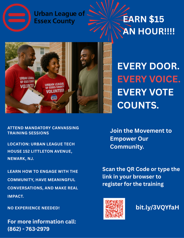 Mandatory training sessions will be held at the Urban League Tech House, 152 Littleton Avenue, Newark, NJ, where volunteers will learn practical skills for canvassing and community outreach.
