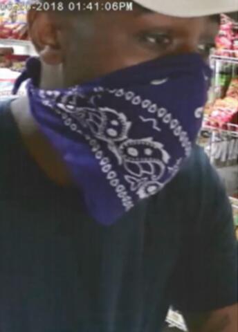 Officials say the suspect is described as a dark complexion male with tattoos on both arms. He was last seen wearing a tan hat, dark blue shirt, blue jean shorts, a black belt, black sneakers and a purple and white bandana over his face.