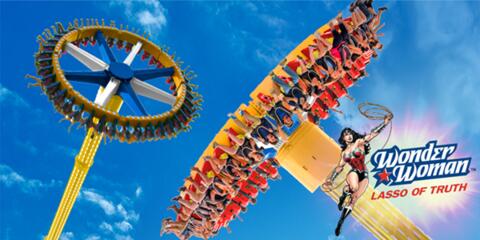 WONDER WOMAN Lasso of Truth will be the tallest pendulum ride in the world, reaching gravity-defying heights up to 17 stories in the air. On this sinister new adventure, you'll sit in floorless seats on the outside of a giant circular disk that swings back and forth and spins round and round.