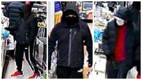 Police say suspect #1 was seen carrying a black handgun and was clad in a dark hooded puffer jacket, a baseball cap with a white brim, a white face covering, black gloves, a red shirt, dark blue denim pants, and red sneakers.